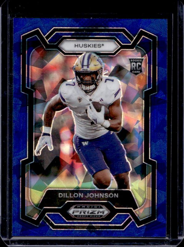 The Dillon Johnson 2024 Prizm Draft Picks #173 Blue Ice /99 Rookie card is 1 of 54 Dillon Johnson's card variations in the 2024 Prizm Draft Picks set being tracked by Sports Card Investor, including Base, Green, Purple Wave, Red Ice, and Ruby Wave.