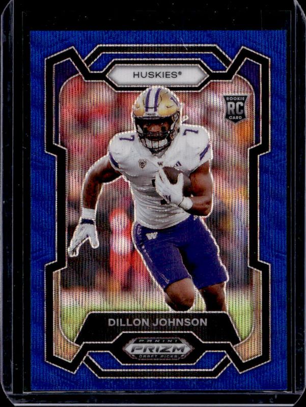 The Dillon Johnson 2024 Prizm Draft Picks #173 Blue Wave /249 Rookie card is 1 of 54 Dillon Johnson's card variations in the 2024 Prizm Draft Picks set being tracked by Sports Card Investor, including Base, Green, Purple Wave, Red Ice, and Ruby Wave.