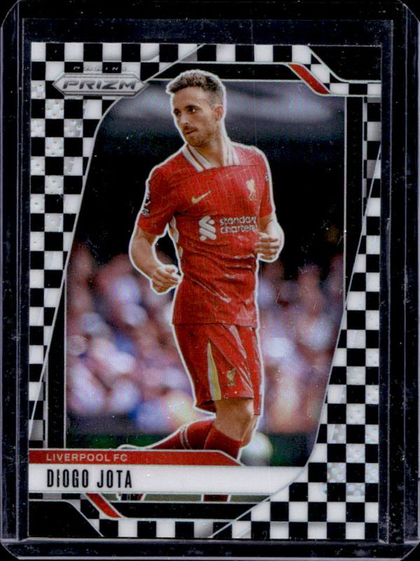 The Diogo Jota 2024 Prizm Premier League #46 Black & White Checker card is 1 of 75 Diogo Jota's card variations in the 2024 Prizm Premier League set being tracked by Sports Card Investor, including Base, Blue Mosaic, Breakaway, Choice, and Choice Red White & Blue.