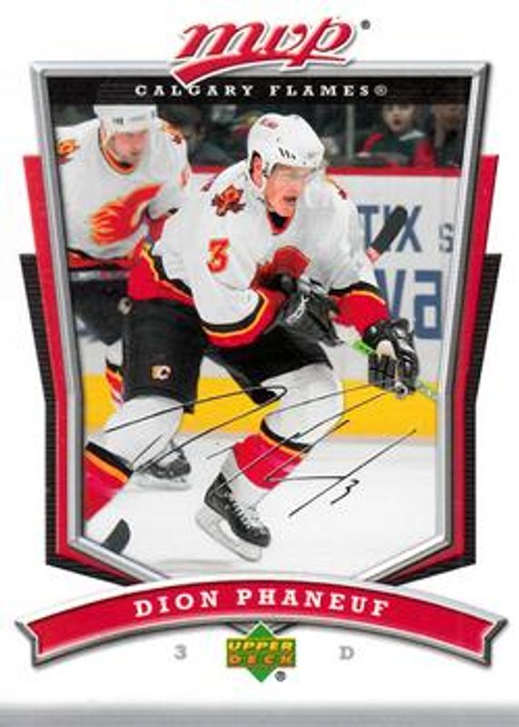 The Dion Phaneuf 2007 Upper Deck MVP #116 Base card is 1 of 3 Dion Phaneuf's card variations in the 2007 Upper Deck MVP set being tracked by Sports Card Investor, including Gold Scripts /100, and Super Scripts /25.