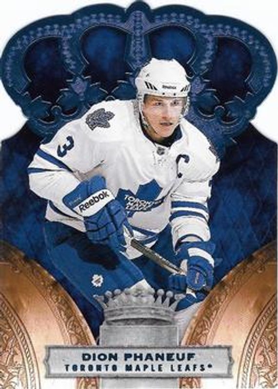 The Dion Phaneuf 2010 Crown Royale #90 Ice Blue /10 card is 1 of 9 Dion Phaneuf's card variations in the 2010 Crown Royale set being tracked by Sports Card Investor, including Base /499, Premiere Date /100, Purple /25, Red /1, and Royal Pains /499.
