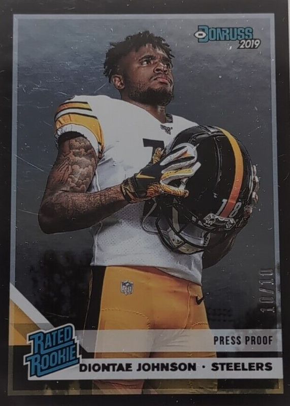 The Diontae Johnson 2019 Donruss #327 Press Proof Black /10 Rookie card in Raw condition has not changed in price in the last 30 days and was last sold for $8.60 .