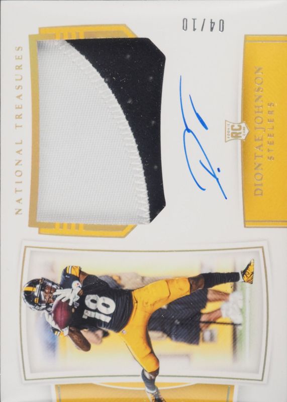 This card is 1 of 11 Diontae Johnson's card variations in the 2019 National Treasures set being tracked by Sports Card Investor, including Rookie Patch Auto /99, Rookie Patch Auto - Green Jersey Number (/18), Rookie Patch Auto - Holo Silver /25, Rookie Patch Auto - Midnight /20, and Rookie Patch Auto - Black /5.
