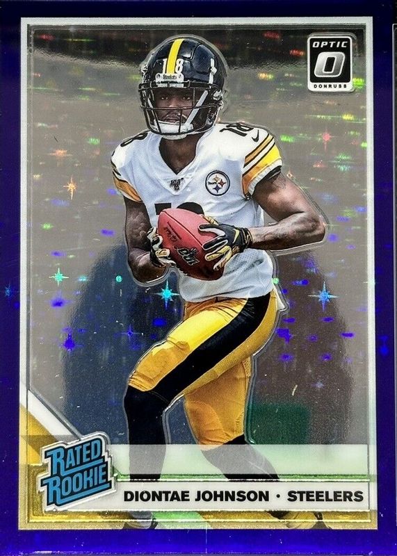 The Diontae Johnson 2019 Optic #177 FOTL Purple Stars /25 Rookie card in Raw condition has not changed in price in the last 30 days and was last sold for $13.50 .
