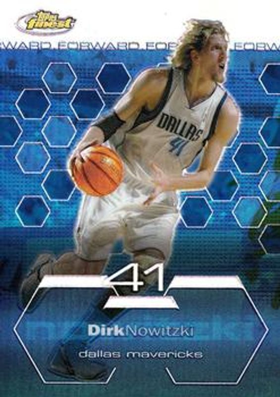 The Dirk Nowitzki 2002 Topps Finest #1 Refractor /250 card is 1 of 3 Dirk Nowitzki's card variations in the 2002 Topps Finest set being tracked by Sports Card Investor, including Base, and Gold Refractor /25.