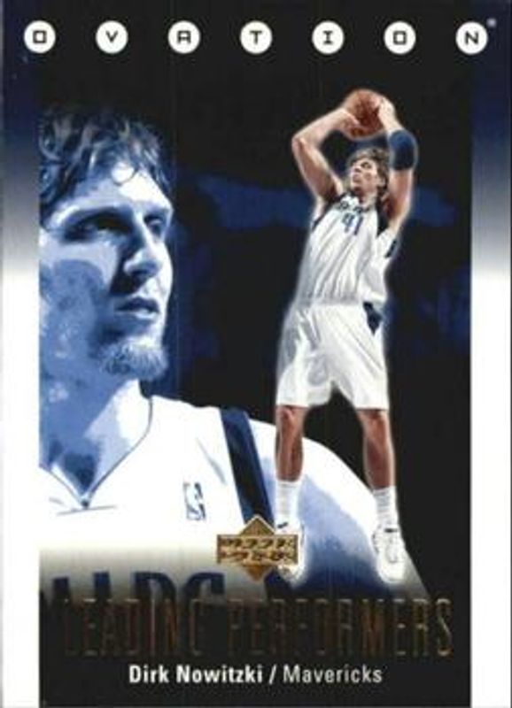 The Dirk Nowitzki 2006 Upper Deck Ovation #LP-DN Leading Performers card is 1 of 5 Dirk Nowitzki's card variations in the 2006 Upper Deck Ovation set being tracked by Sports Card Investor, including Base /999, Gold /99, Apparel, and Apparel - Gold /50.