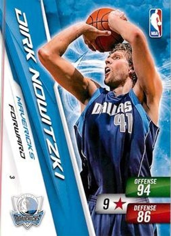 The Dirk Nowitzki 2010 Panini Adrenalyn XL #3 Base card is 1 of 2 Dirk Nowitzki's card variations in the 2010 Panini Adrenalyn XL set being tracked by Sports Card Investor, including Extra.