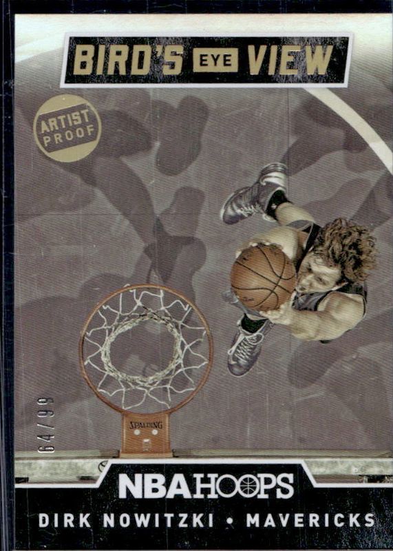 The Dirk Nowitzki 2015 Hoops #9 Bird's Eye View - Holo Artist Proof /99 card in Raw condition has not changed in price in the last 30 days and was last sold for $5.01 .