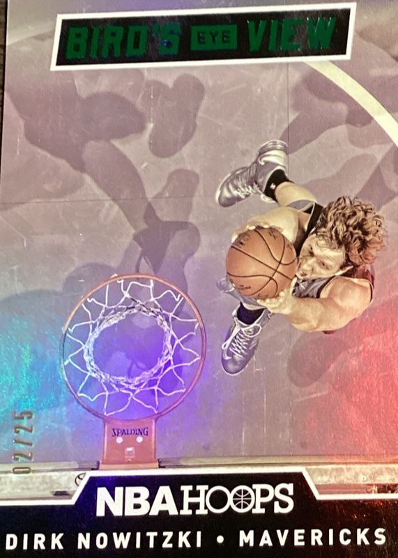The Dirk Nowitzki 2015 Hoops #9 Bird's Eye View - Holo Green /25 card in Raw condition has not changed in price in the last 30 days and was last sold for $12.85 .