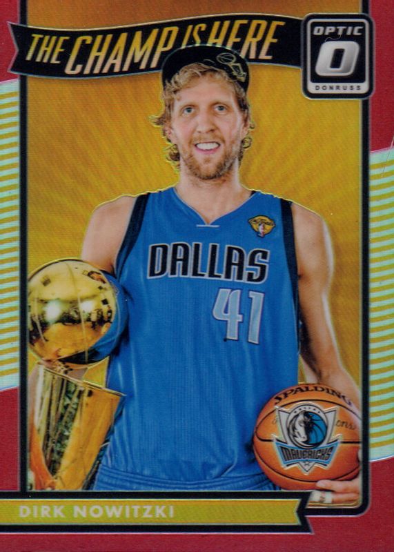 The Dirk Nowitzki 2016 Optic #9 The Champ is Here - Red /99 card in Raw condition has not changed in price in the last 30 days and was last sold for $12.80 .