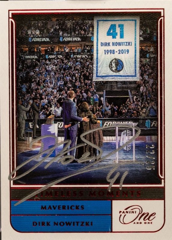 The Dirk Nowitzki 2021 One and One #TM-DNK Timeless Moments Autographs - Red /25 card in Raw condition has not changed in price in the last 30 days and was last sold for $1,376.00 .