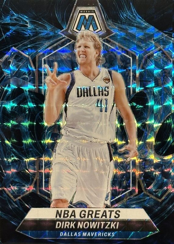 This card is 1 of 23 Dirk Nowitzki's card variations in the 2023 Mosaic set being tracked by Sports Card Investor, including NBA Greats - Choice Peacock /(SSP), NBA Greats - Fast Break Purple /50, NBA Greats - Glitter /(SSP), NBA Greats - White Sparkle /(SSP), and NBA Greats - International Blue /25.
