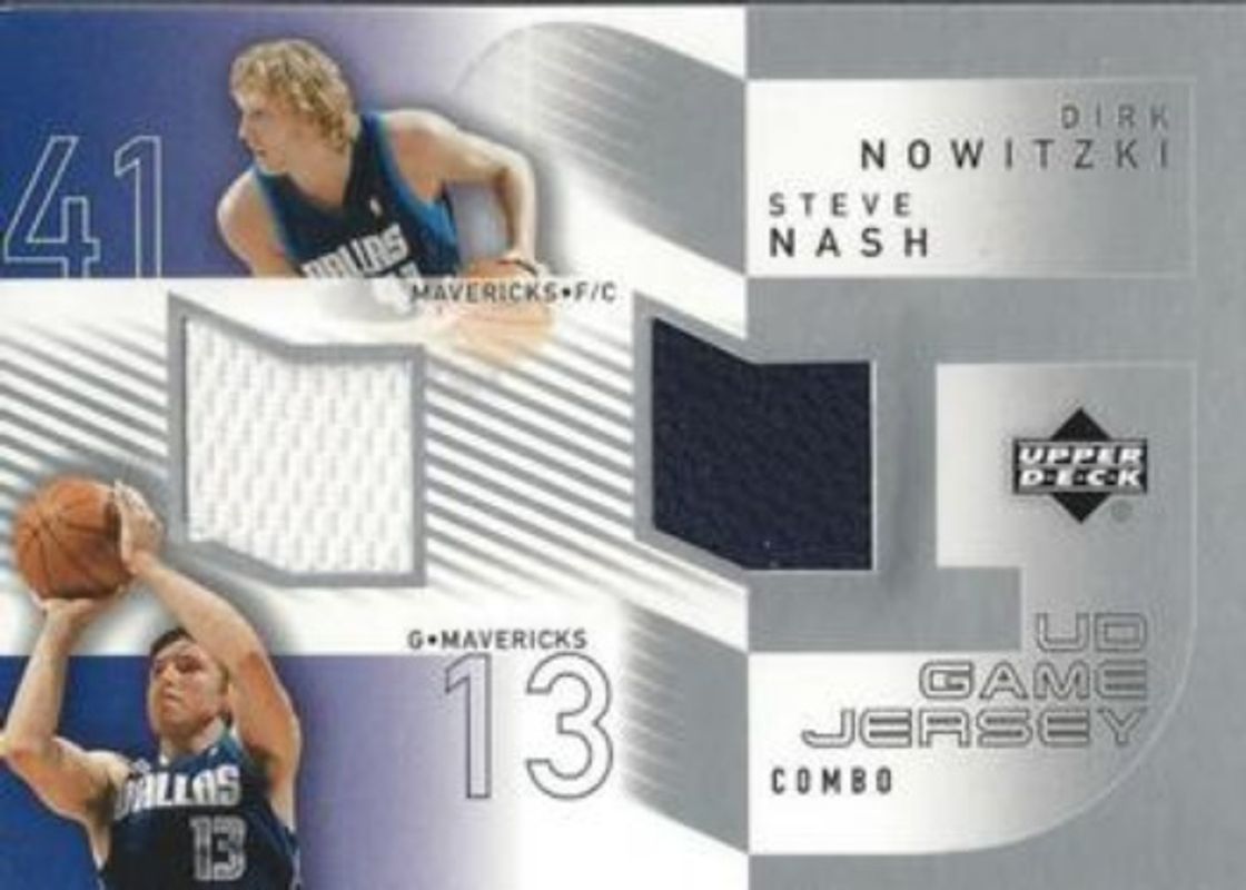 The Dirk Nowitzki / Steve Nash 2002 Upper Deck #DN/SN UD Game Jersey Combos card is 1 of 2 Dirk Nowitzki / Steve Nash's card variations in the 2002 Upper Deck set being tracked by Sports Card Investor, including Combo NBA All Star Authentics /300.