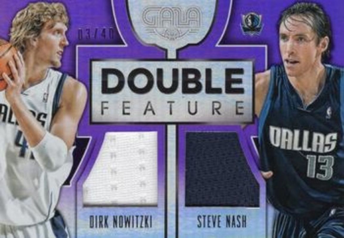 The Dirk Nowitzki / Steve Nash 2015 Gala #2 Double Feature Memorabilia Purple /40 card is 1 of 4 Dirk Nowitzki / Steve Nash's card variations in the 2015 Gala set being tracked by Sports Card Investor, including Double Feature Memorabilia /60, Double Feature Memorabilia Crimson /5, and Double Feature Memorabilia Midnight /1.