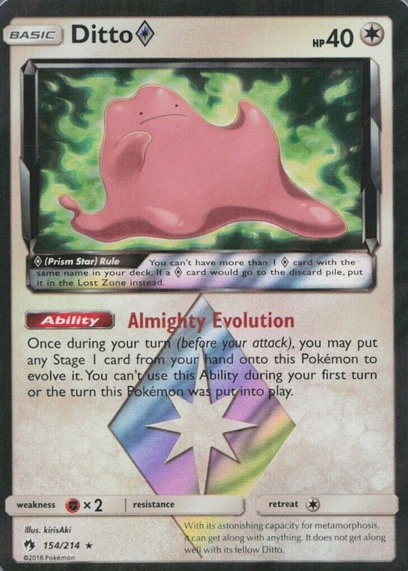 The Ditto Prism Star 2018 Sun & Moon: Lost Thunder #154/214 Holo card in Raw TCG (Near Mint) condition has moved up $2.01 (+20.1%) in the last 30 days and was last sold for $12.00 .