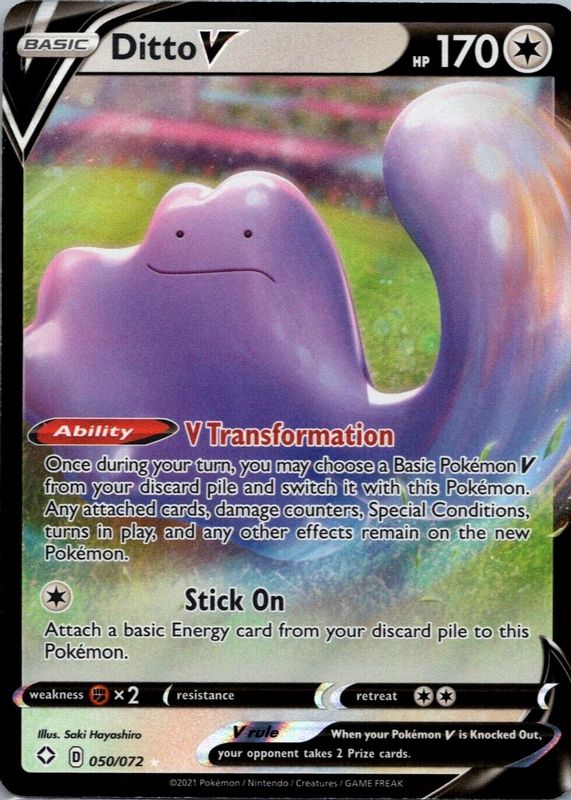 The Ditto V 2021 Sword & Shield: Shining Fates #050/072 Holo card in Raw TCG (Near Mint) condition has moved down -$1.28 (-31.4%) in the last 30 days and was last sold for $2.80 .