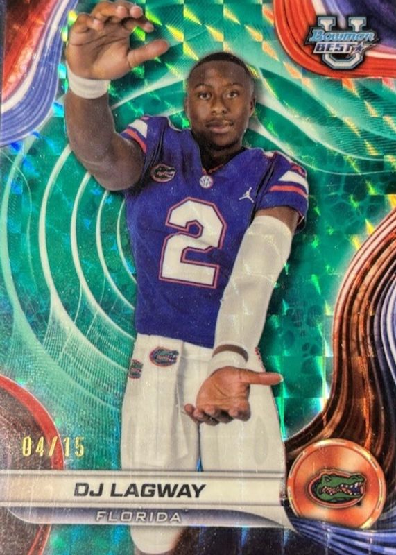 This card is 1 of 35 DJ Lagway's card variations in the 2024 Bowman Best University set being tracked by Sports Card Investor, including Base, Refractor, Speckle Refractor, Aqua Refractor /225, and Blue Refractor /149.