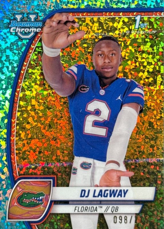 This card is 1 of 43 DJ Lagway's card variations in the 2024 Bowman Chrome University set being tracked by Sports Card Investor, including Base (1st), Pink Lava Refractor (1st), Purple Shimmer Refractor (1st), Refractor (1st), and Stealth Refractor (1st).