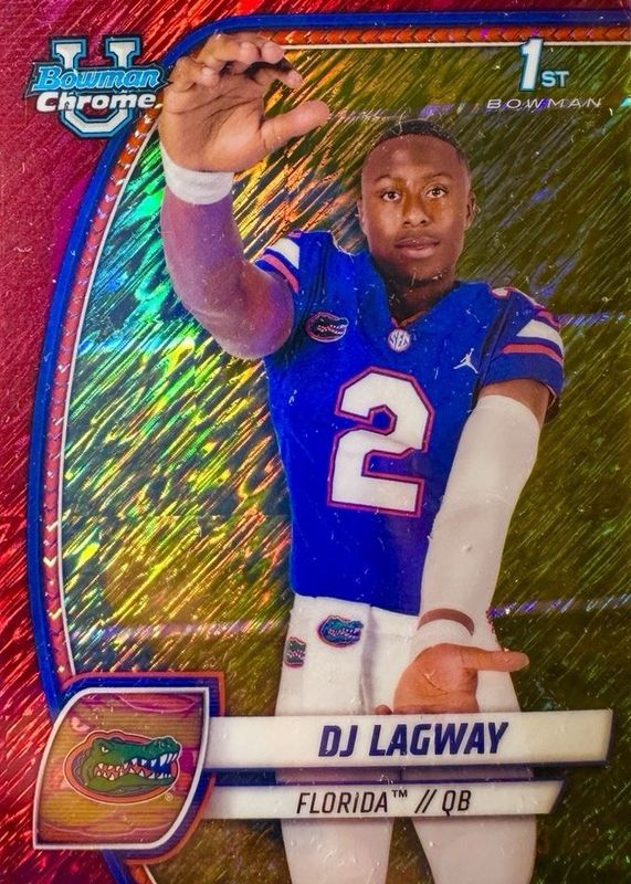 This card is 1 of 43 DJ Lagway's card variations in the 2024 Bowman Chrome University set being tracked by Sports Card Investor, including Base (1st), Pink Lava Refractor (1st), Purple Shimmer Refractor (1st), Refractor (1st), and Stealth Refractor (1st).