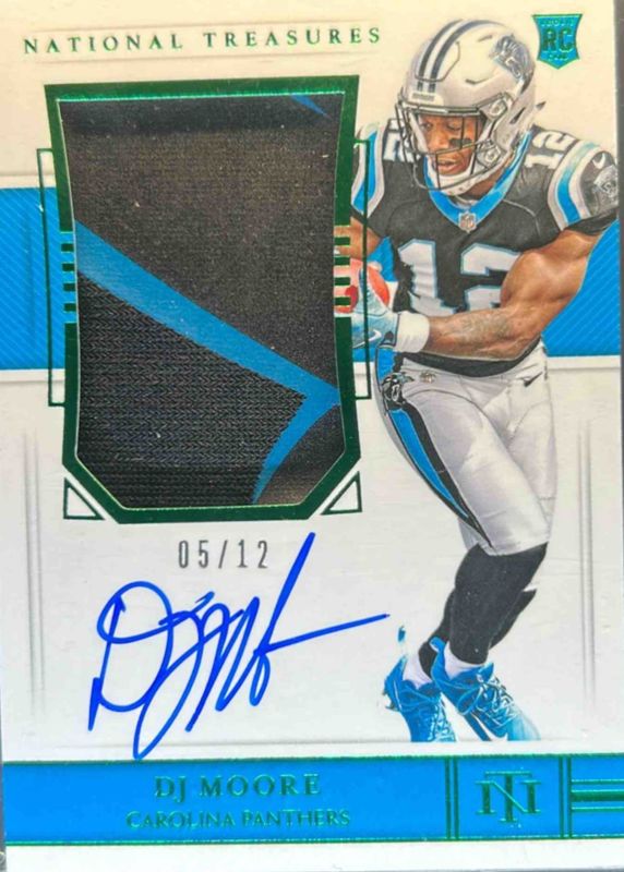 The DJ Moore 2018 National Treasures #184 Rookie Patch Auto - Green Jersey Number (/12) card in Raw condition has not changed in price in the last 30 days and was last sold for $115.00 .