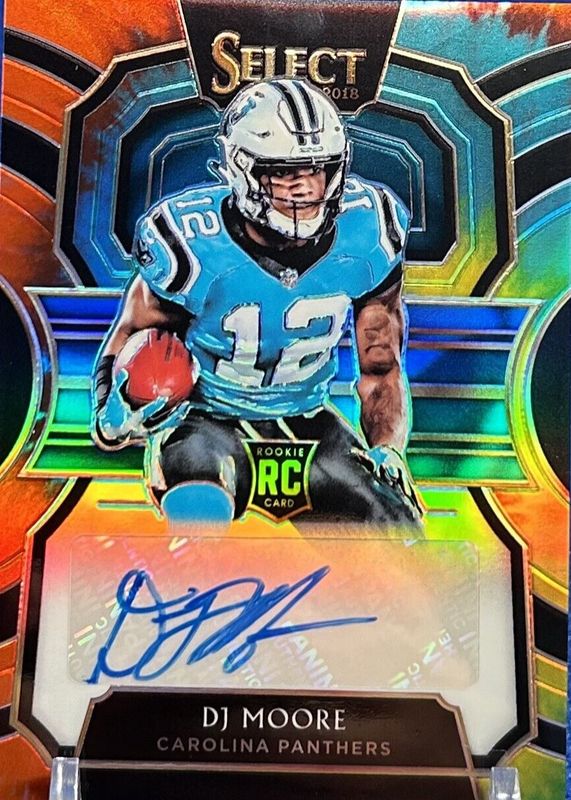The DJ Moore 2018 Select #RS-DJ Rookie Signatures - Tie-Dye (/25) card in Raw condition has not changed in price in the last 30 days and was last sold for $56.55 .