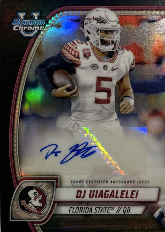 The DJ Uiagalelei 2024 Bowman Chrome University #PA-DUI Prospect Auto - Black Refractor /10 card in Raw condition has not changed in price in the last 30 days and was last sold for $24.99 .