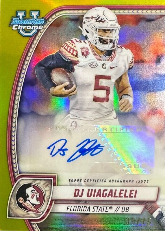 The DJ Uiagalelei 2024 Bowman Chrome University #PA-DUI Prospect Auto - Yellow Refractor /75 card in Raw condition has not changed in price in the last 30 days and was last sold for $8.97 .