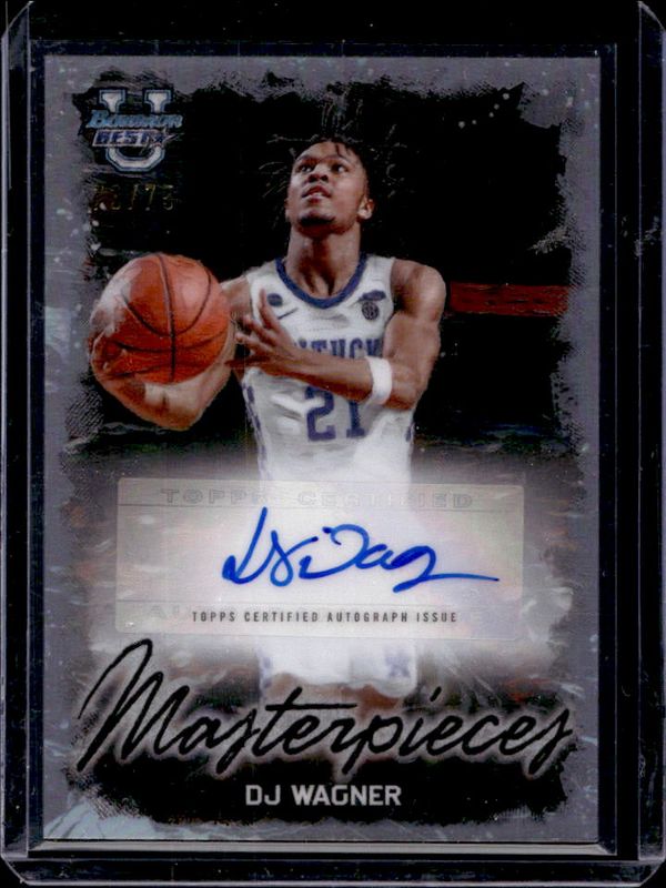 The DJ Wagner 2023 Bowman Best University #BMA-DW Masterpieces Autographs /75 card is 1 of 76 DJ Wagner's card variations in the 2023 Bowman Best University set being tracked by Sports Card Investor, including Base, Refractor, Speckle Refractor, Blue Refractor /150, and Pink Lava Refractor /100.