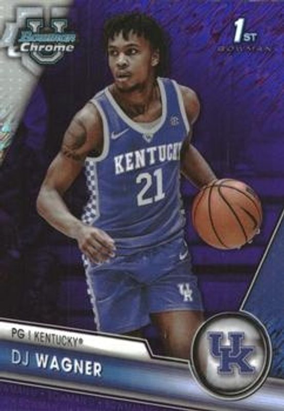 The DJ Wagner 2023 Bowman Chrome University #43 Purple Shimmer Refractor card is 1 of 78 DJ Wagner's card variations in the 2023 Bowman Chrome University set being tracked by Sports Card Investor, including #43b Base, #43 Base, #43 Pink Refractor, #43 Refractor, and #43 X-Fractor.