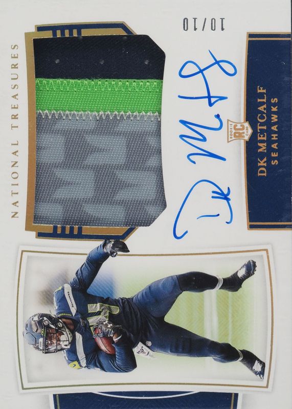 This card is 1 of 11 DK Metcalf's card variations in the 2019 National Treasures set being tracked by Sports Card Investor, including Rookie Patch Auto /99, Rookie Patch Auto - Green Jersey Number (/14), Rookie Patch Auto - Holo Silver /25, Rookie Patch Auto - Midnight /20, and Rookie Patch Auto - Black /5.