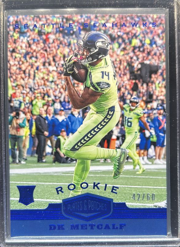 The DK Metcalf 2019 Plates & Patches #181 Blue /60 Rookie card is 1 of 59 DK Metcalf's card variations in the 2019 Plates & Patches set being tracked by Sports Card Investor, including Base /99, Purple /35, Green /25, Red /10, and Gold /1.