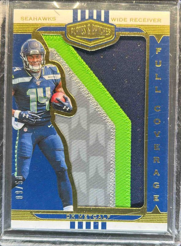The DK Metcalf 2019 Plates & Patches #FC28 Full Coverage Relics /50 Rookie card is 1 of 59 DK Metcalf's card variations in the 2019 Plates & Patches set being tracked by Sports Card Investor, including Base /99, Blue /60, Purple /35, Green /25, and Red /10.