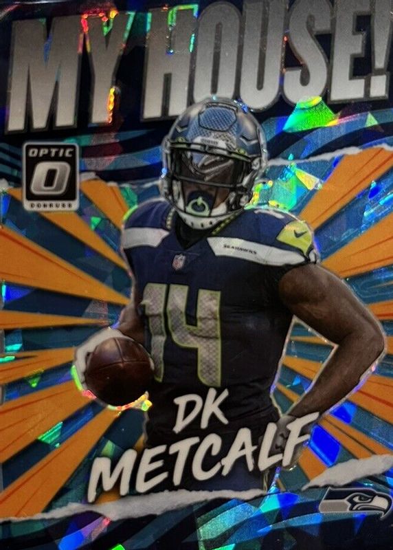 This card is 1 of 11 DK Metcalf's card variations in the 2021 Optic set being tracked by Sports Card Investor, including My House!, Downtown /(SSP), Downtown - Black Pandora /25, My House! - Black Pandora /25, and My House! - Purple Stars /25.