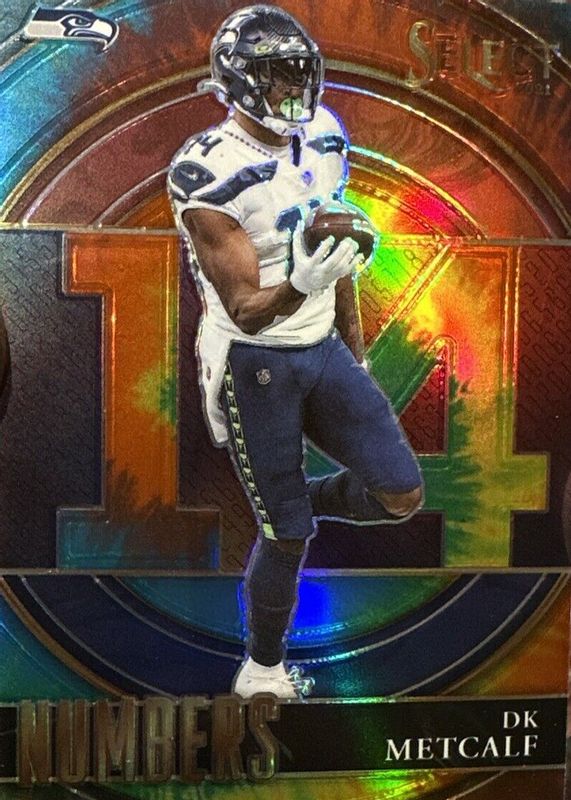 This card is 1 of 12 DK Metcalf's card variations in the 2021 Select set being tracked by Sports Card Investor, including Select Numbers - Zebra /(SSP), Sensations - Zebra /(SSP), Sensations - Tie-Dye /25, Select Numbers - Gold /10, and Sensations - Gold /10.