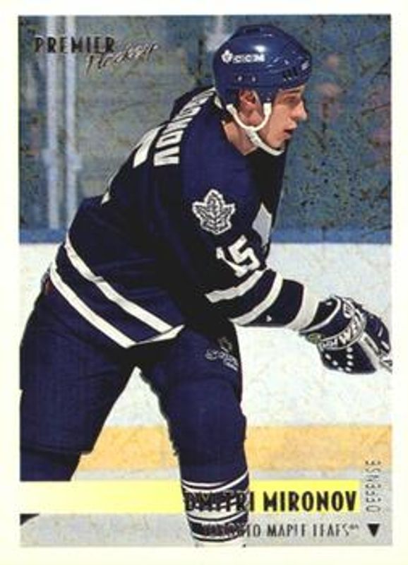 The Dmitri Mironov 1994 Topps Premier #165 Special Effects card is 1 of 2 Dmitri Mironov's card variations in the 1994 Topps Premier set being tracked by Sports Card Investor, including Base.