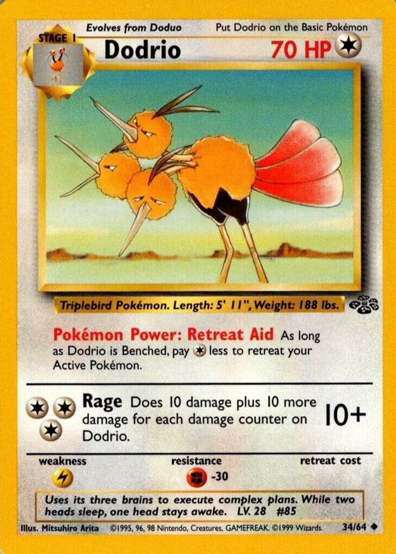 The Dodrio 1999 Jungle #34/64 Unlimited card in Raw TCG (Near Mint) condition has moved up $1.32 (+66.3%) in the last 30 days and was last sold for $3.31 .