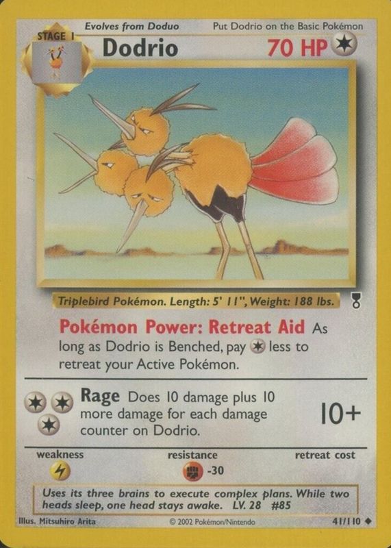 The Dodrio 2002 Legendary Collection #41 Base card in Raw TCG (Near Mint) condition has not changed in price in the last 30 days and was last sold for $5.99 .