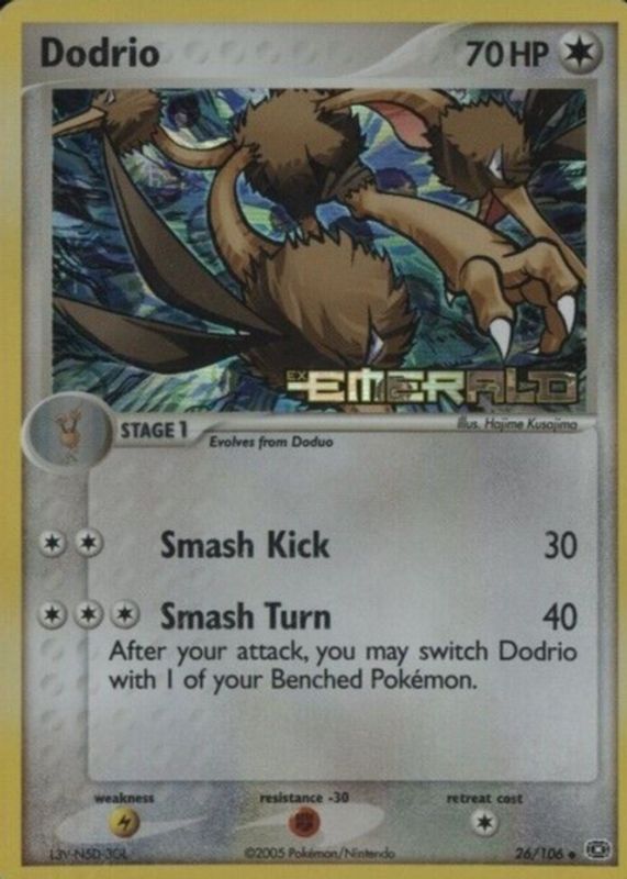 The Dodrio 2005 EX: Emerald #026/106 Reverse Holo card in Raw TCG (Near Mint) condition has moved up $5.51 (+39.4%) in the last 30 days and was last sold for $19.51 .