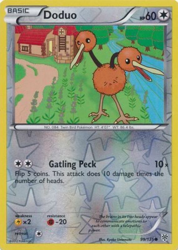 The Doduo 2013 Black & White: Plasma Storm #099/135 Reverse Holo card in Raw TCG (Near Mint) condition has not changed in price in the last 30 days and was last sold for $0.99 .