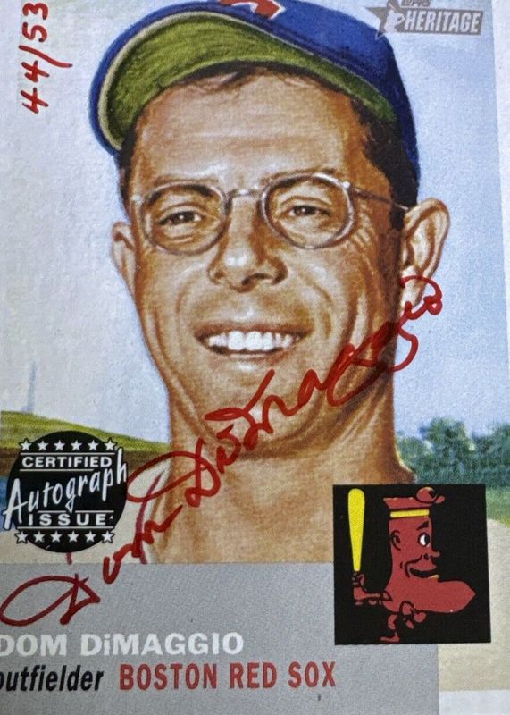 The Dom DiMaggio 2002 Topps Heritage #RO-DD Real One Autographs - Red Ink /53 card in Raw condition has not changed in price in the last 30 days and was last sold for $47.25 .