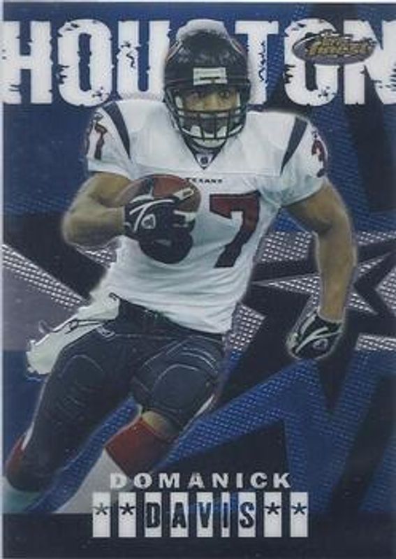 The Domanick Davis 2004 Topps Finest #41 Base /399 card is 1 of 9 Domanick Davis' card variations in the 2004 Topps Finest set being tracked by Sports Card Investor, including Refractors /199, Uncirculated Gold X-Fractors /150, Gold Refractor /50, X-Fractor /5, and Printing Plate Black /1.