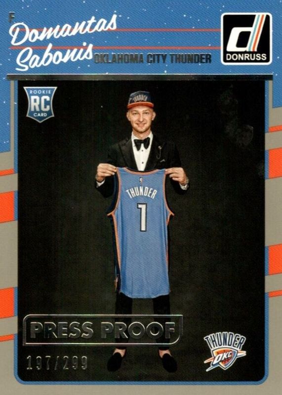 The Domantas Sabonis 2016 Donruss #161 Press Proof Silver /299 Rookie card in Raw condition has not changed in price in the last 30 days and was last sold for $0.99 .