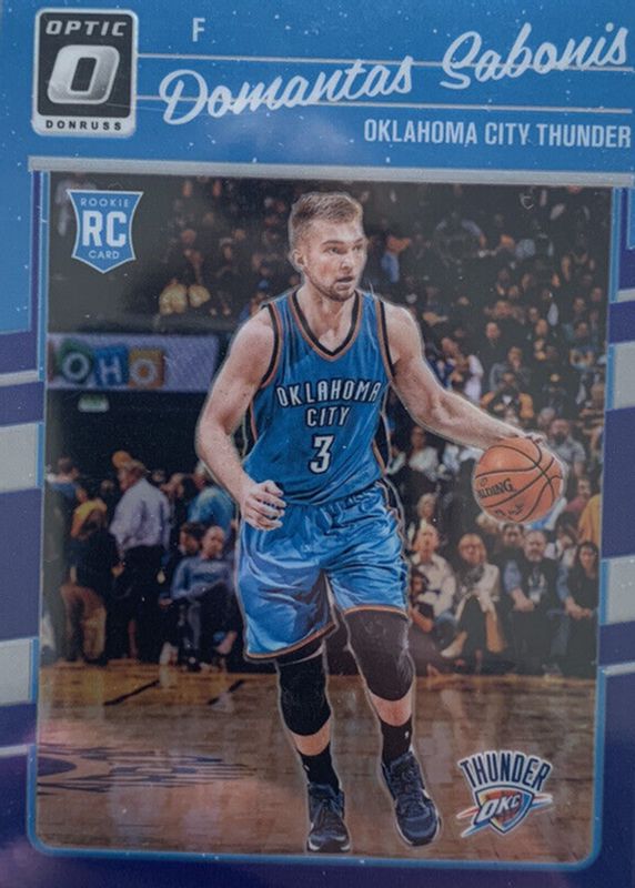 The Domantas Sabonis 2016 Optic #161 Blue /49 Rookie card in Raw condition has not changed in price in the last 30 days and was last sold for $57.75 .