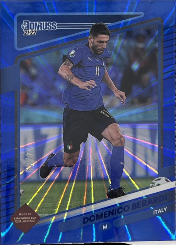 The Domenico Berardi 2021 Donruss #128 Holo Blue Laser /49 card is 1 of 25 Domenico Berardi's card variations in the 2021 Donruss set being tracked by Sports Card Investor, including Base, Holo Green Laser, Holo Orange Laser, Press Proof Gold /349, and Press Proof Purple /199.
