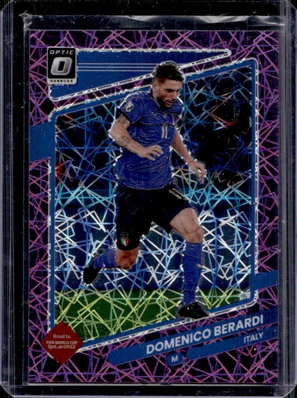 The Domenico Berardi 2021 Donruss #128 Optic - Purple Velocity /99 card is 1 of 25 Domenico Berardi's card variations in the 2021 Donruss set being tracked by Sports Card Investor, including Base, Holo Green Laser, Holo Orange Laser, Press Proof Gold /349, and Press Proof Purple /199.