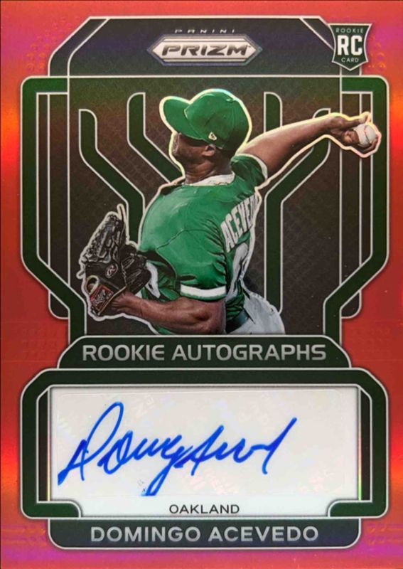 The Domingo Acevedo 2022 Prizm #RA-DA Rookie Autographs - Red /99 card is 1 of 64 Domingo Acevedo's card variations in the 2022 Prizm set being tracked by Sports Card Investor, including Base, Blue, Blue Velocity, Carolina Blue, and Cosmic Haze.