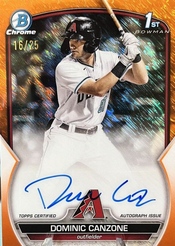 Auctions Ending Soon for Dominic Canzone 2023 Bowman #CPA-DC Chrome Prospect Auto - Orange Shimmer Refractor /25 (1st) RAW