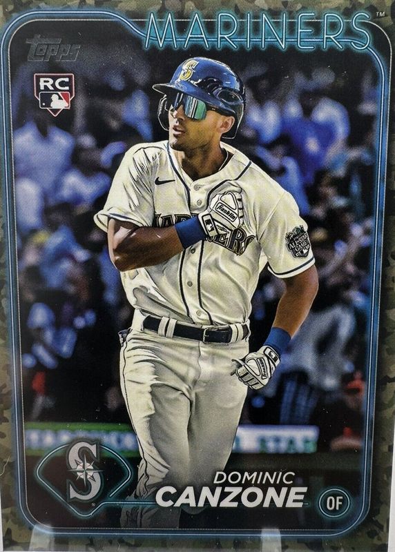 The Dominic Canzone 2024 Topps #195 Memorial Day Camo /25 Rookie card in Raw condition has not changed in price in the last 30 days and was last sold for $9.00 .