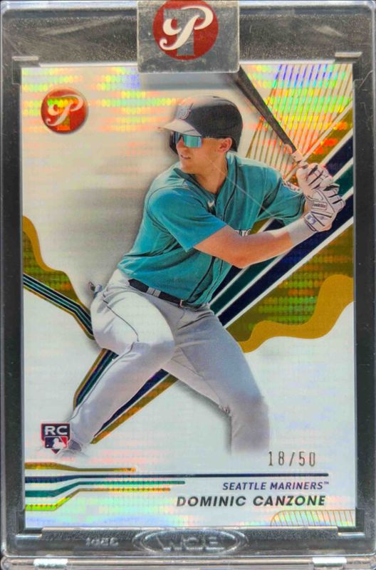 The Dominic Canzone 2024 Topps Pristine #207 Pristine Gold Refractor /50 Rookie card is 1 of 18 Dominic Canzone's card variations in the 2024 Topps Pristine set being tracked by Sports Card Investor, including Base, Pristine Refractor, Refractor, Green Refractor /150, and Pristine Purple Refractor /99.