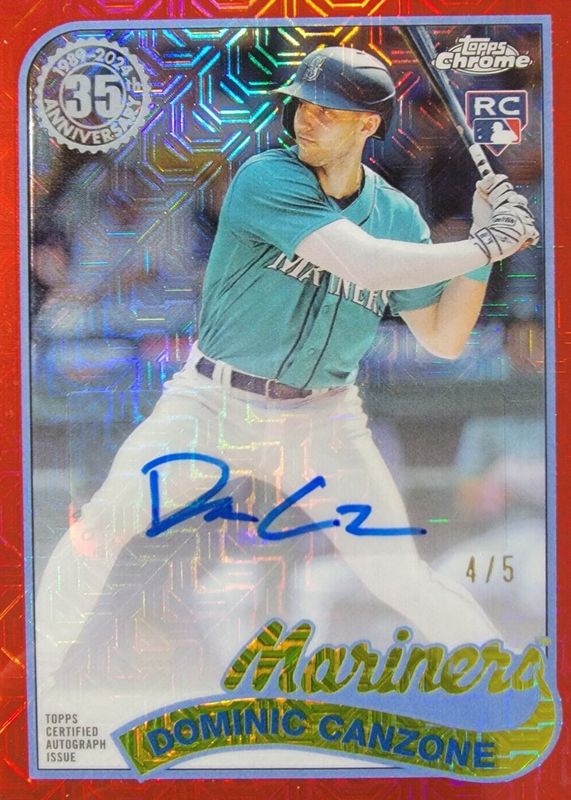 The Dominic Canzone 2024 Topps Silver Pack #2T89C-58 1989 Chrome Promo Autographs - Red Refractor (Series 2) /5 Rookie card in Raw condition has not changed in price in the last 30 days and was last sold for $34.69 .